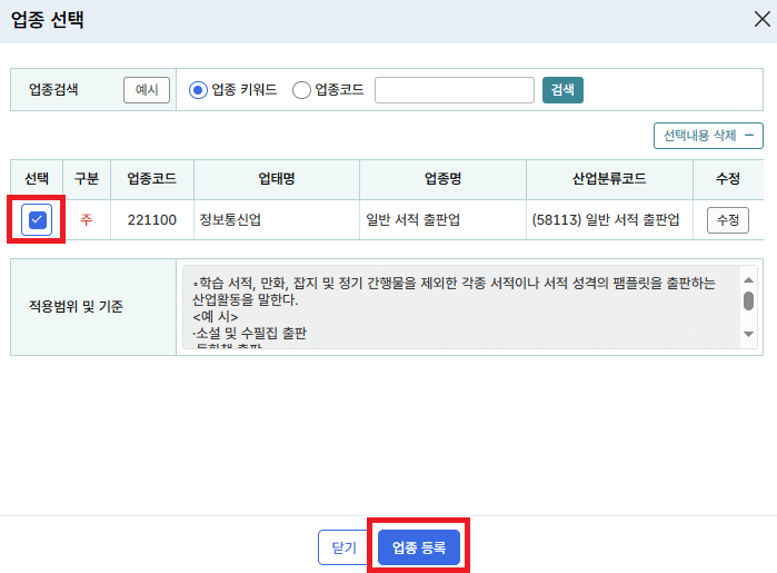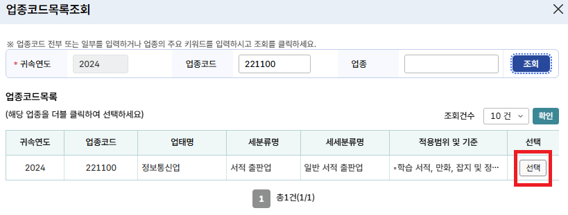 - 업종코드 조회를 눌러 업종코드를 입력 후 (출판사는 업종 코드가 221100) 조회를 누르면 업종코드 목록에 뜹니다.