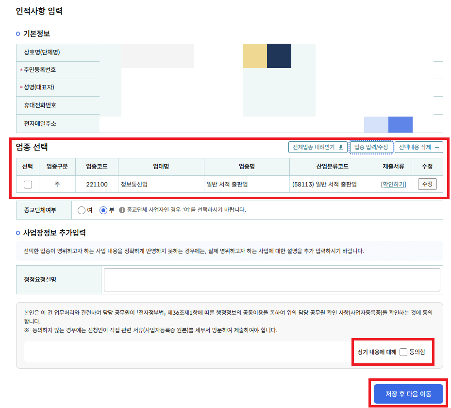 - 상기 내용에 대해 정정하는 것을 동의함에 체크하고 저장 후 다음 이동을 누릅니다.