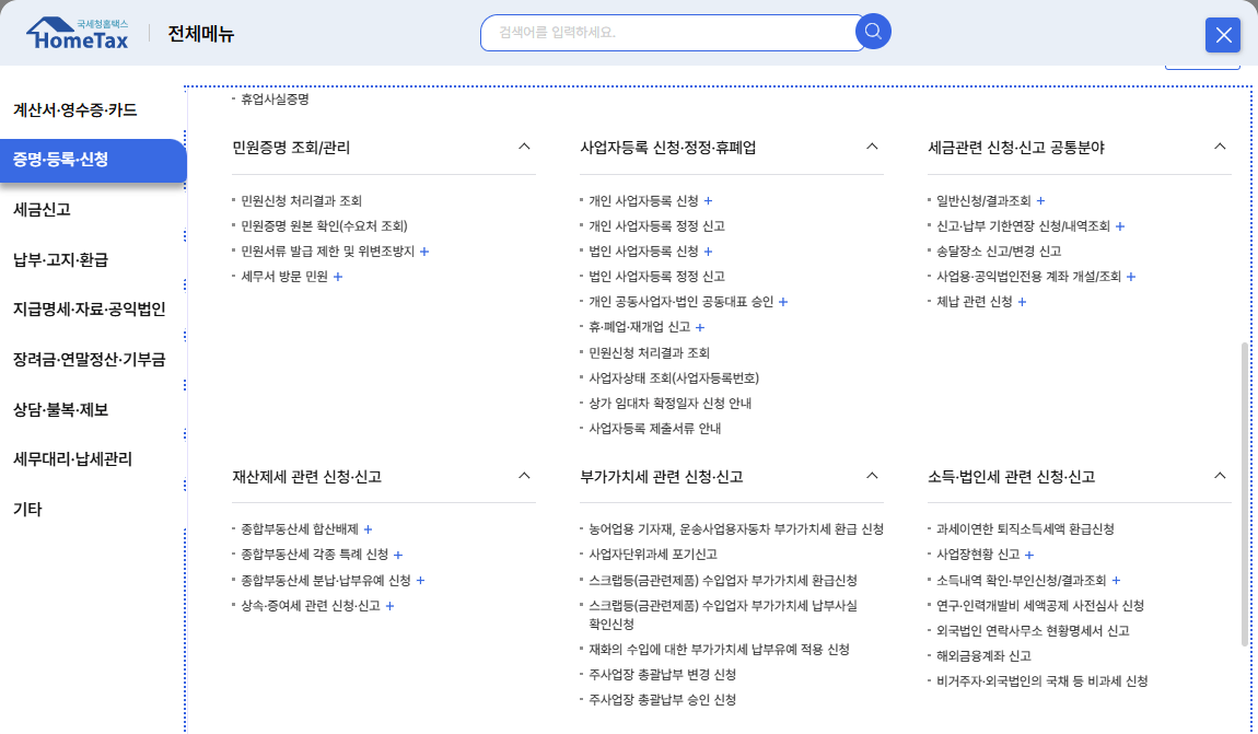 • 증명, 등록 신청에 '개인사업자등록 신청'을 누릅니다.