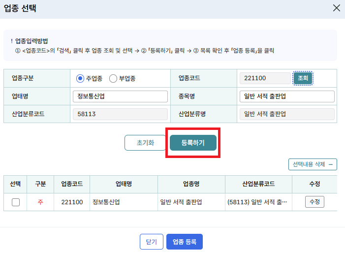 - 해당되는 업종코드를 선택하고 등록하기를 누른 후 다시 업종코드를 선택하고 업종 등록을 누릅니다.