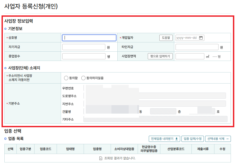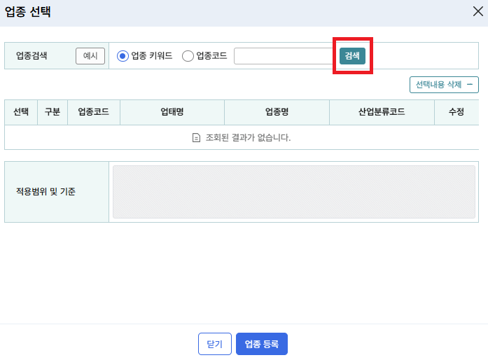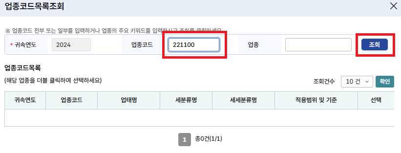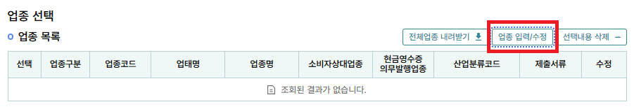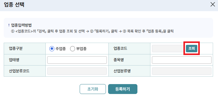 - 검색을 누르고 업종코드를 알고 있다면 입력해서 조회를 누르고, 모른다면 업종 이름을 검색해서 조회해도 됩니다.