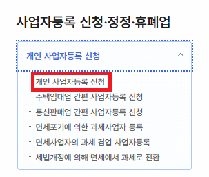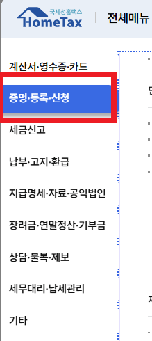 - 증명, 등록 신청에 '개인사업자등록 신청'을 누릅니다.