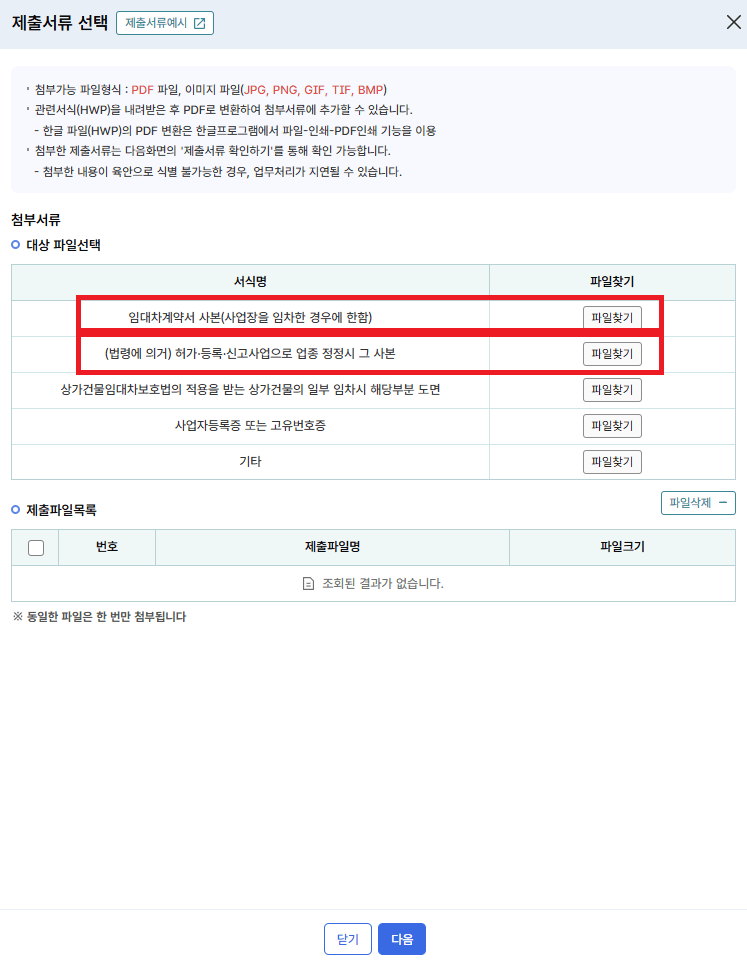 • 사업자를 하려고 하는 업종의 등록증, 확인증을 업로드하고 다음을 누릅니다.