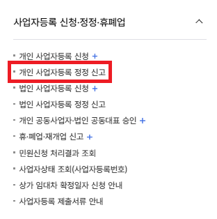 - 홈택스 로그인 후 증명, 등록, 신청에 사업자등록 신청, 정정, 휴폐업에 들어가 개인사업자등록 정정 신고를 누릅니다.
