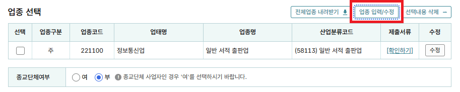 - 업종 변경을 위해 업종 입력/수정을 누릅니다.