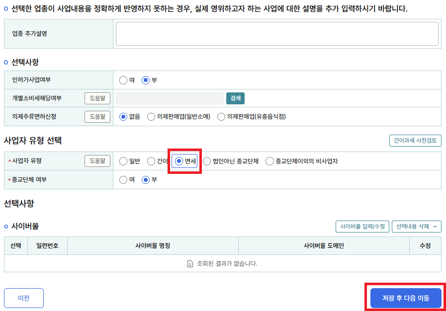 - 사업자유형을 선택하고 저장 후 다음 이동을 누릅니다. ( 사업자 유형을 모른다면 인터넷에서 검색 또는 세무서에 직접 문의 )