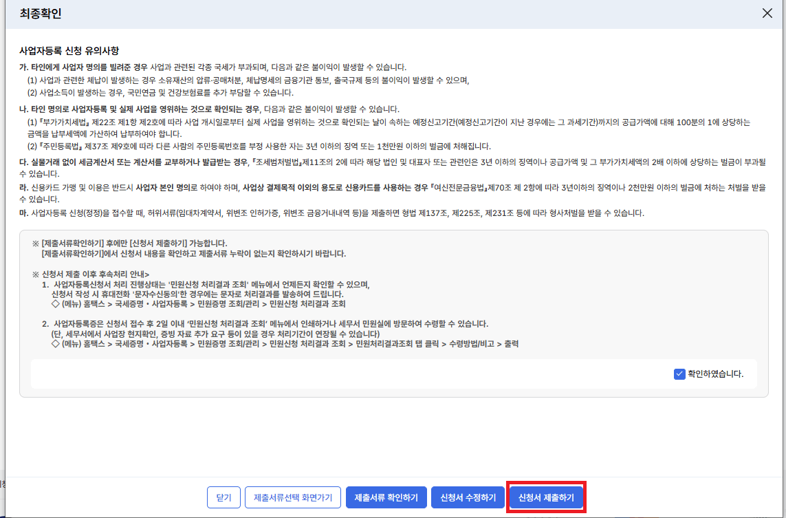 • 보통 제대로 신청했다면 신청 후 2~3일 내에 처리 완료되어 사업자등록증이 발급됩니다. (관할서마다 처리기간이 더 길어질 수도 있습니다.)