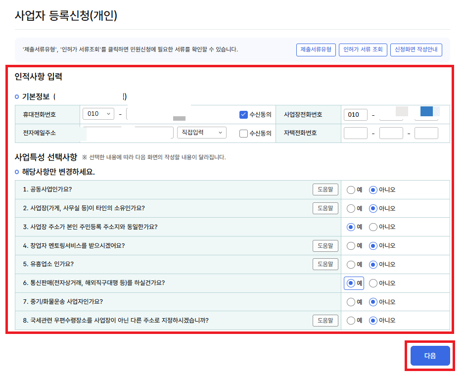 - 본인에게 해당되는 내용을 정확하게 입력합니다.