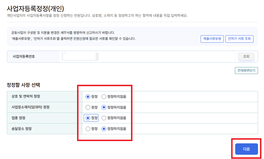 - 저는 상호명과 업종 변경을 선택해서 상호명을 변경합니다.