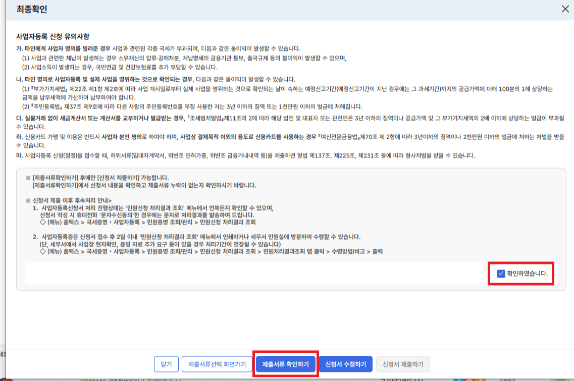 - '확인하였습니다'를 체크하고 제출서류확인하기 누릅니다.