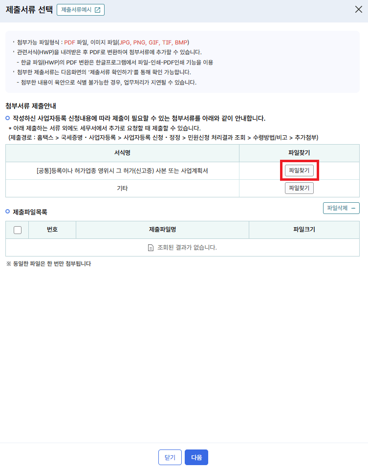 - 사업자를 하려고 하는 업종의 등록증, 확인증을 업로드하고 다음을 누릅니다.