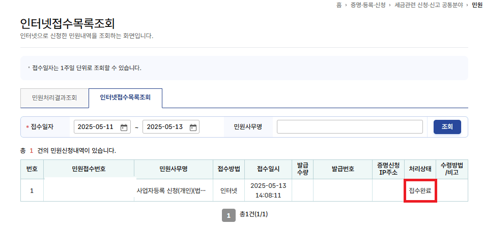 - 접수목록에 들어가면 접수완료라고 처리상태가 뜹니다.